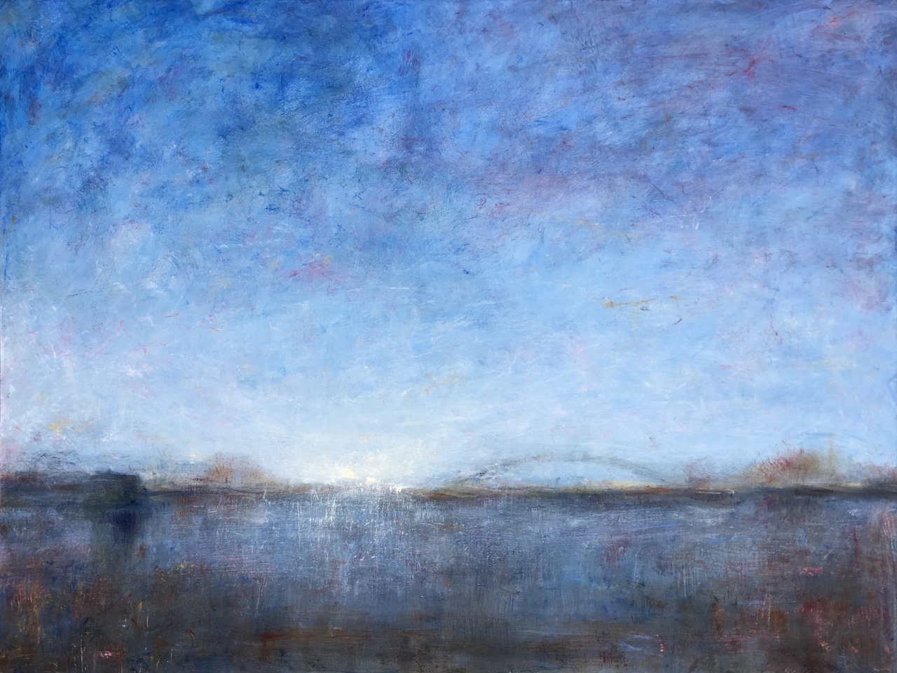 Een weidse blik op de Rijn, de brug bij Oosterbeek in de verte.