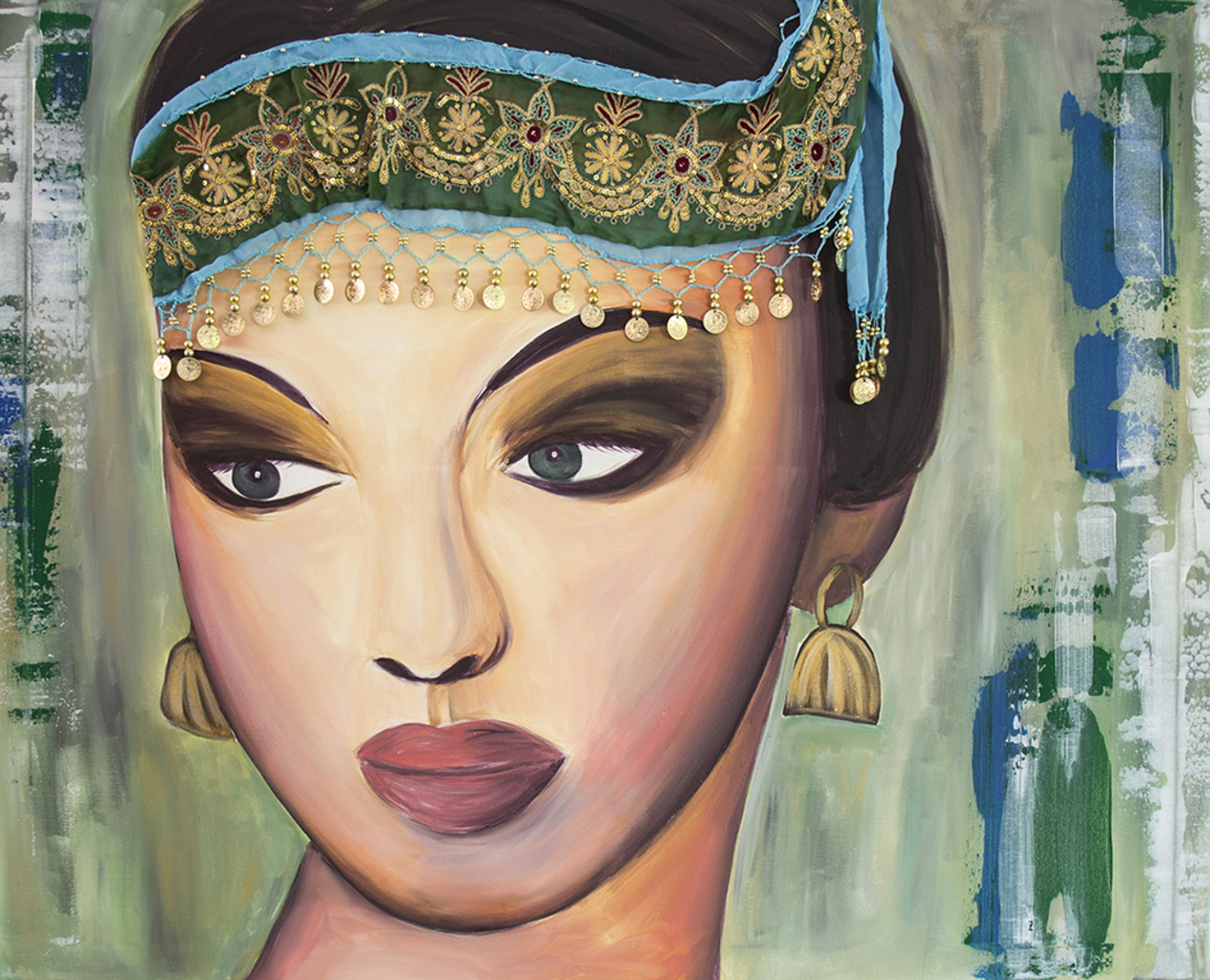 Groot schilderij van een mooie Indiase bruid. Om goed de sfeer van het land te proeven, heb ik gebruik gemaakt van echte stof uit India, afkomstig van een sari, bewerkt met gouddraad en pailletten. Het portret is geschilderd met goudtinten. Het gezicht is realistisch met een abstracte achtergrond, waarin ik de kleuren groen en blauw van het doek terug heb laten komen.