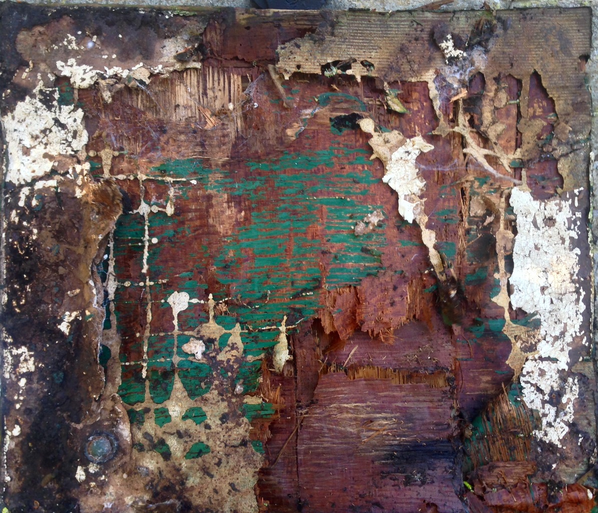 Diverse schimmels op een houtendeksel, ontstaan door vocht en duisternis.