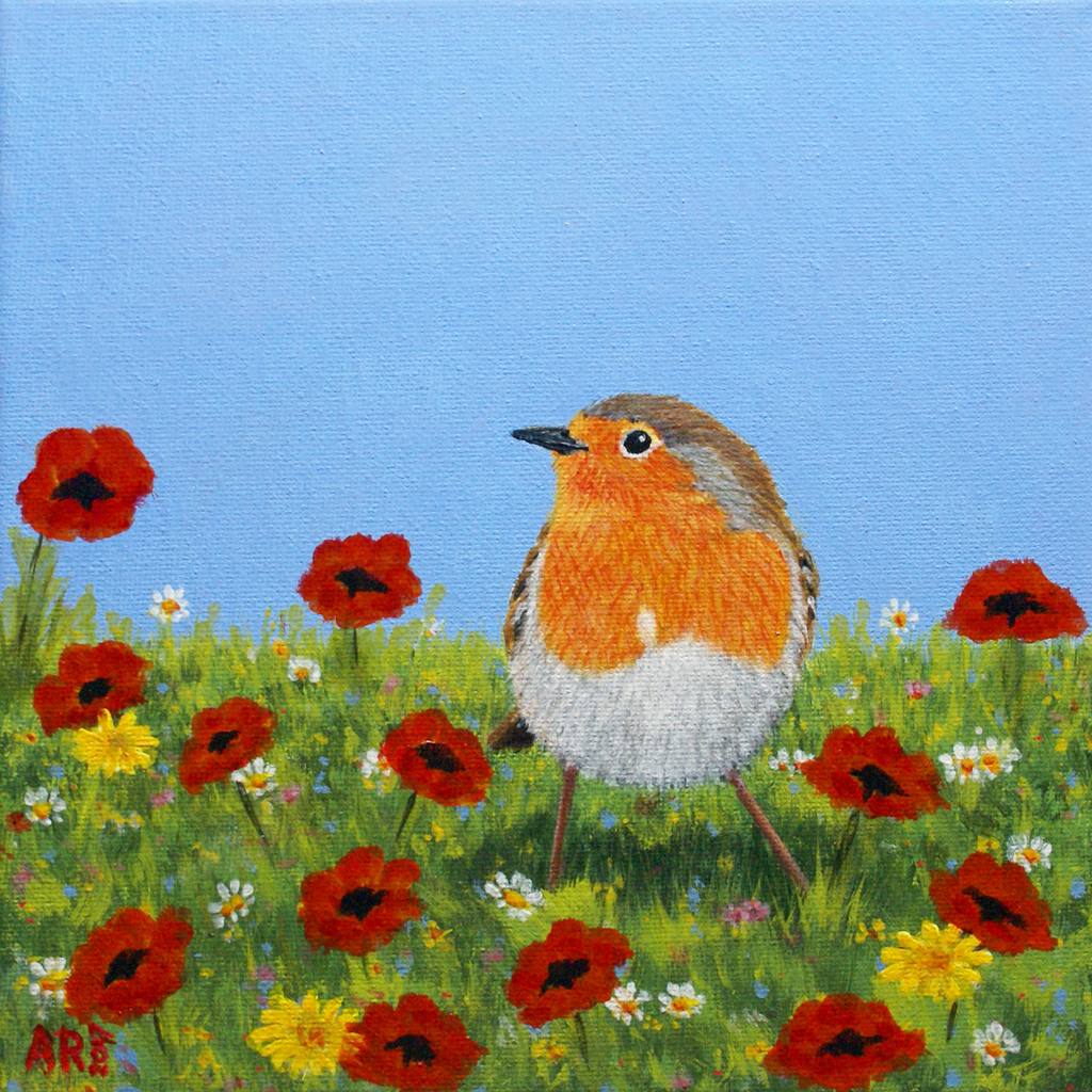 Schilderij Vogel Art Painting Acrylic Klaprozen Bird Roodborstje Robin Poppies Kunstkaart Vogelkunst