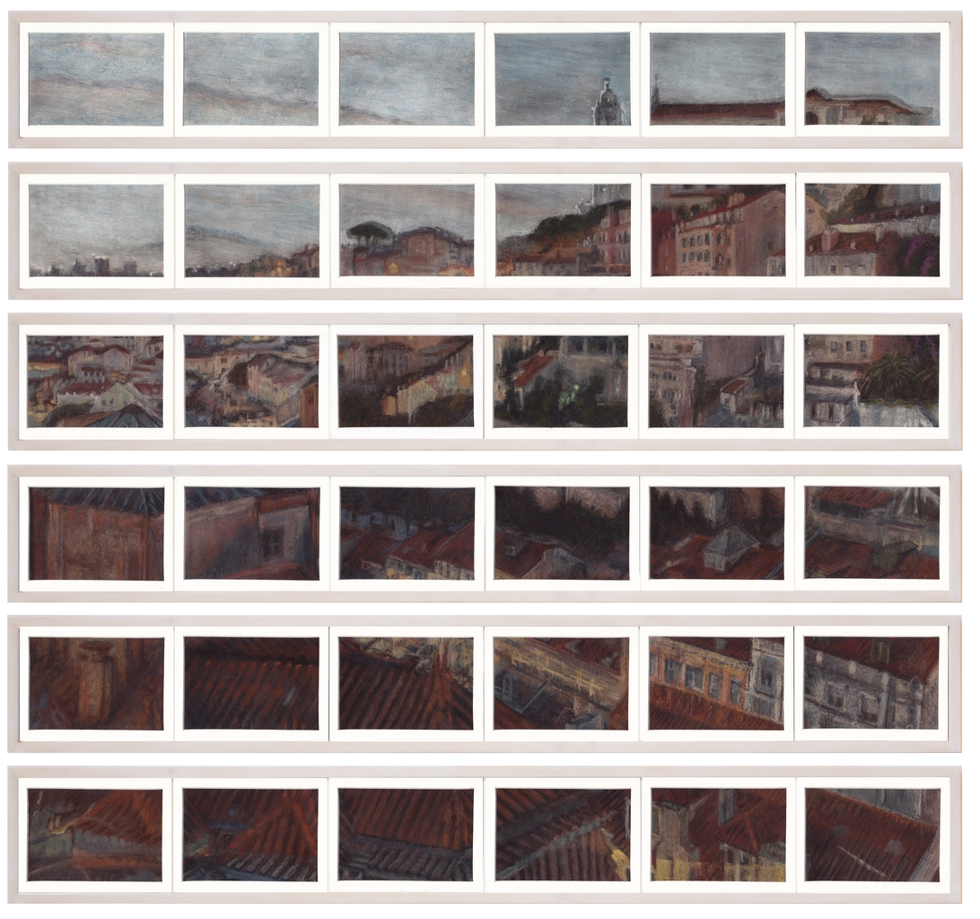 Dit kunstwerk is een combinatie van 36 kleine tekeningen. Samen vormen deze een grotere afbeelding die weer verdeeld is in 6 delen, en op die manier is ingelijst. Ik koos voor deze manier van werken en presenteren omdat het de manier nabootst waarop een groter beeld of uitzicht gezien wordt. Hoewel je als beschouwer het idee hebt dat je een landschap als een groot beeld ziet focus je feitelijk op kleine delen ervan. Met dat concept als uitgangspunt dwong ik mijzelf anders te kijken naar wat ik zag, en tegelijkertijd maakt het dat je als beschouwer ook anders, geconcentreerder gaat kijken. Deze tekening is het resultaat van een heel aantal observaties gedurende een aantal weken, gedaan vanaf de Costa do Castelo in Lissabon, Portugal. Elke tekening begon met een tekening in inkt om een soort basisritme van lijnen en richtingen te maken. Daarna zijn deze verder uitgewerkt in pastel om er op die manier een kleurrijk en samenhangend geheel van te maken. Op de foto ziet u een mogelijke manier van presenteren. Afhankelijk van de ruimte aan de muur kan het werk ook anders gepresenteerd worden. Hierbij is uw eigen verbeelding aan zet.