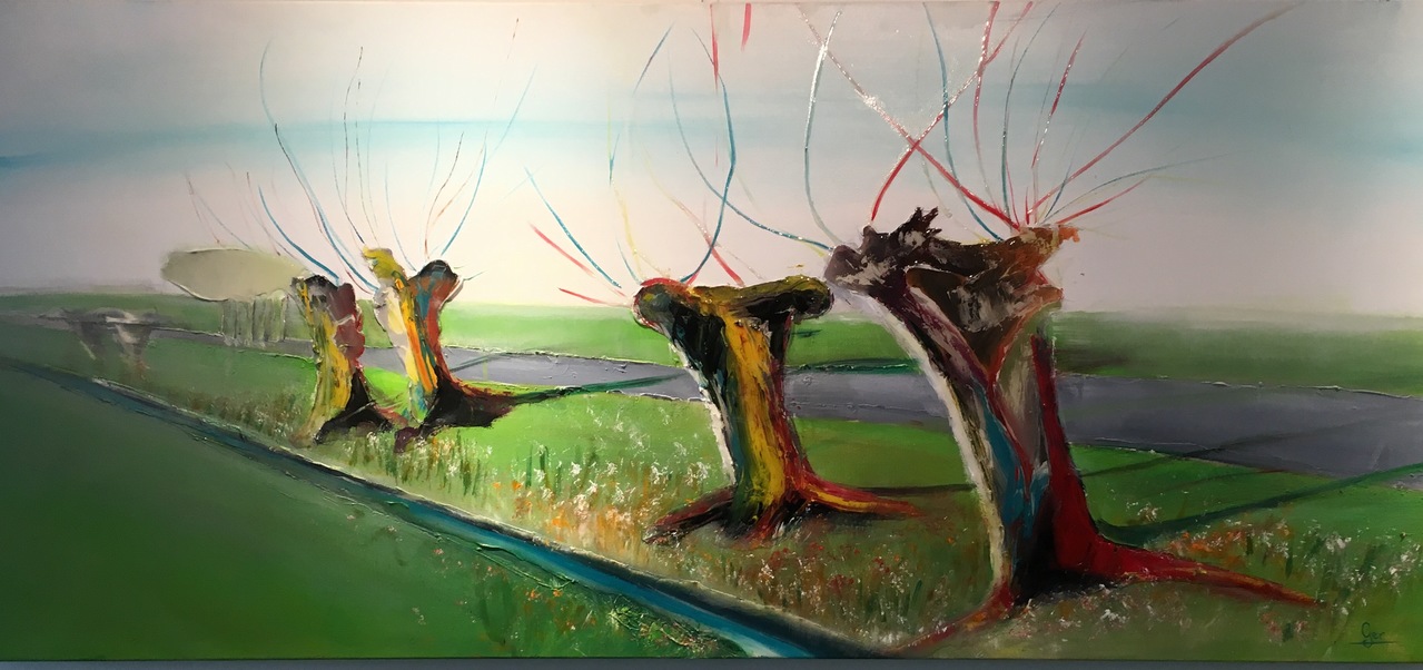 Natuur Knotwilgen Realistisch Gestileerd Kleurrijk Rood Blauw Groen Geel Platteland Sloot Toplaag Lak Olieverf Spelen Met De Passie Positiviteit Liefde Mooi