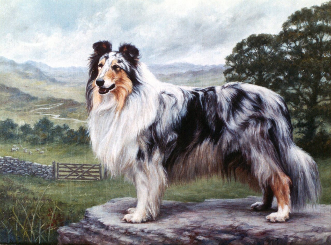 Een portret van de Collie Tamar; haar vachtkleur was blue merle. Zij staat afgebeeld tegen een Schots berglandschap.