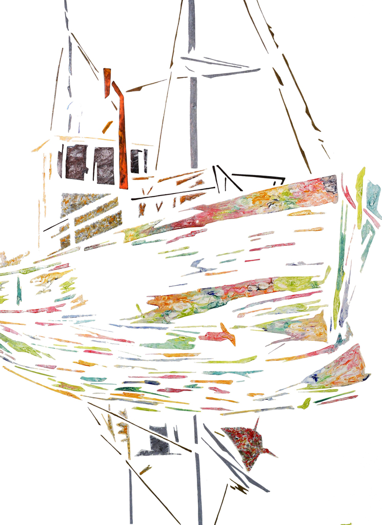 Aan de kust van het schiereiland Varanger, bij het in 2006 opgerichte Varangerhalvøya Nasjonalpark (‘halvøya’ betekent half- eiland), op een van de noordelijkste punten van Noorwegen, ligt het dorpje Jakobselvkaia. Het is een vissersdorpje met een klein haventje. Overal rondom staan conische stapels houten palen, er hangen visnetten te drogen op hoge rekken en oude, zo te zien niet meer gebruikte vissersboten staan op het droge. Het Varanger-schiereiland, bestaat uit grassige of stenige vlakten (‘blokkmark’) en een lage bergrug met als hoogste punt de 366m hoge Skipskjølen. Het heeft een Arctische flora en er leven o.a. rietganzen, dwergganzen en poolvossen. Dit is een van de drie werken van deze vissersboten.