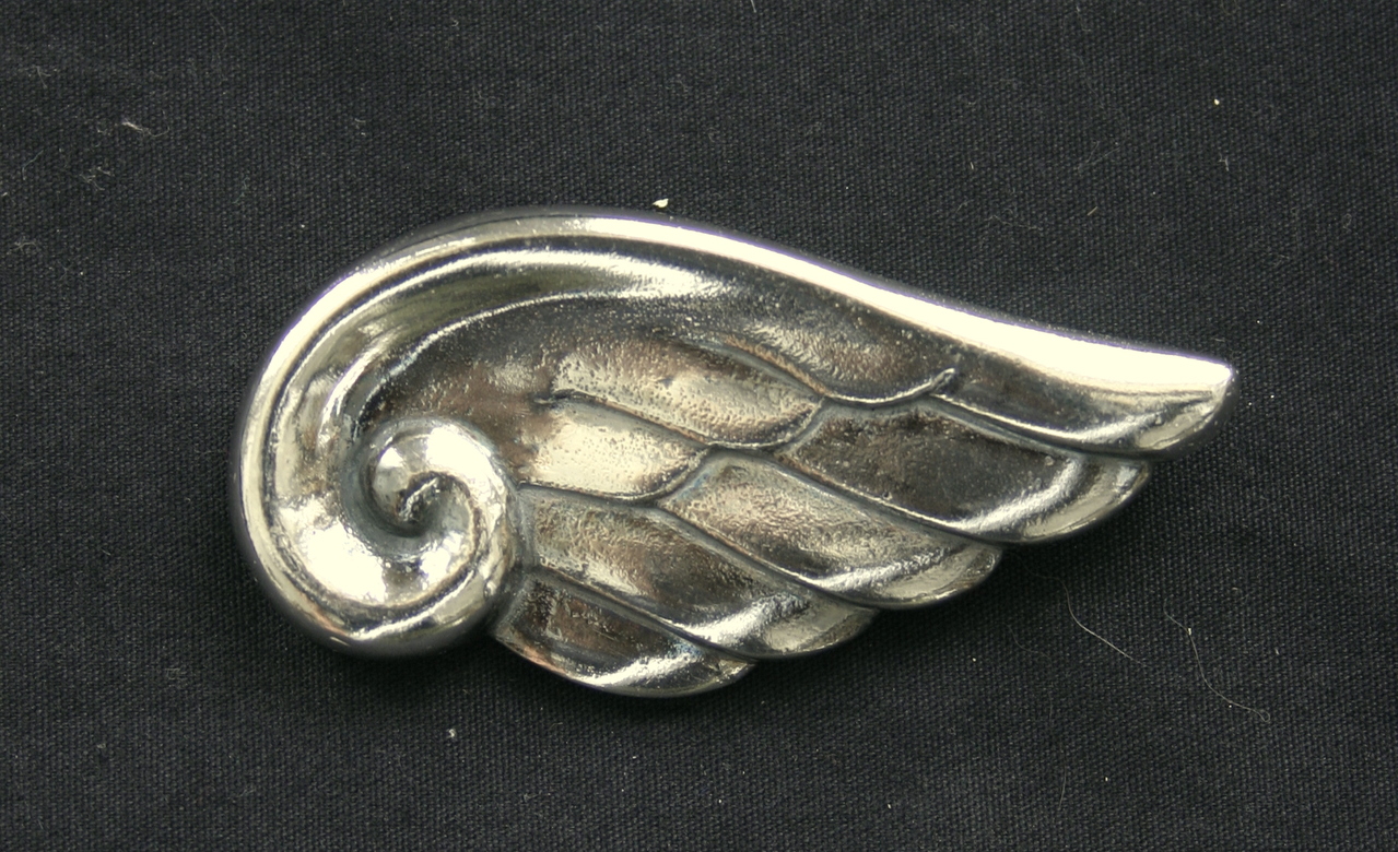 Een zilveren broche/hanger in de vorm van een vleugeltje ( 60 x 32 mm).