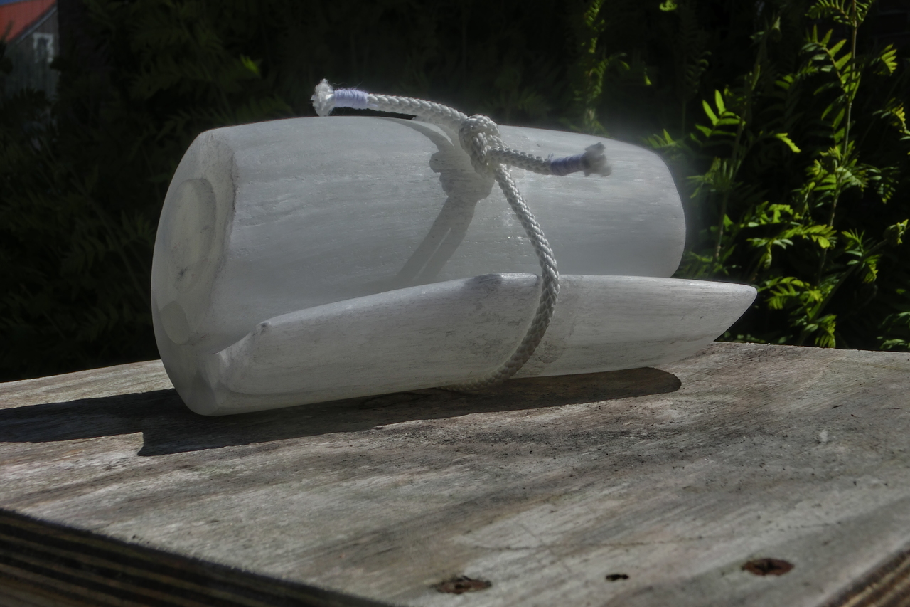 Een opgerolde doek samengebonden met een koordje. Materiaal is seleniet.