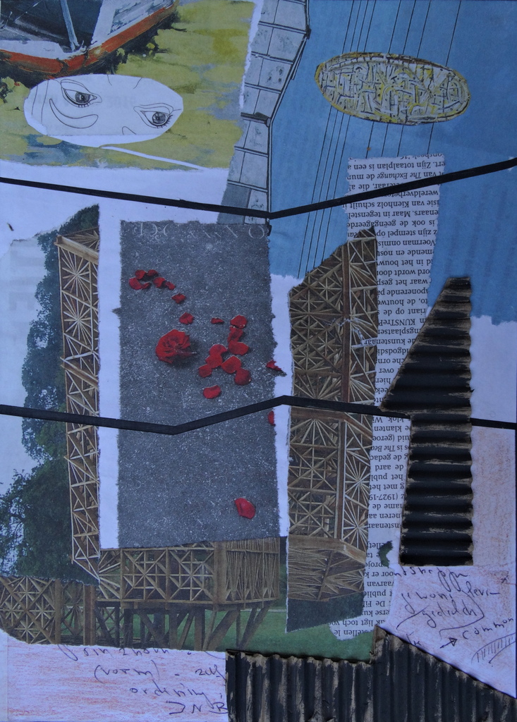Pogingen te komen tot eenheid / eindigen vaak in verdeeldheid. // Elementen zijn behept / met de neiging / los te komen van elkaar / totdat krachten samenballen / die elk geheel / doen samen smelten. Collage papier, karton, verf. Deel van International Collage Exhibition/Exchange 2017 en daar verkocht; nu in particuliere collectie.