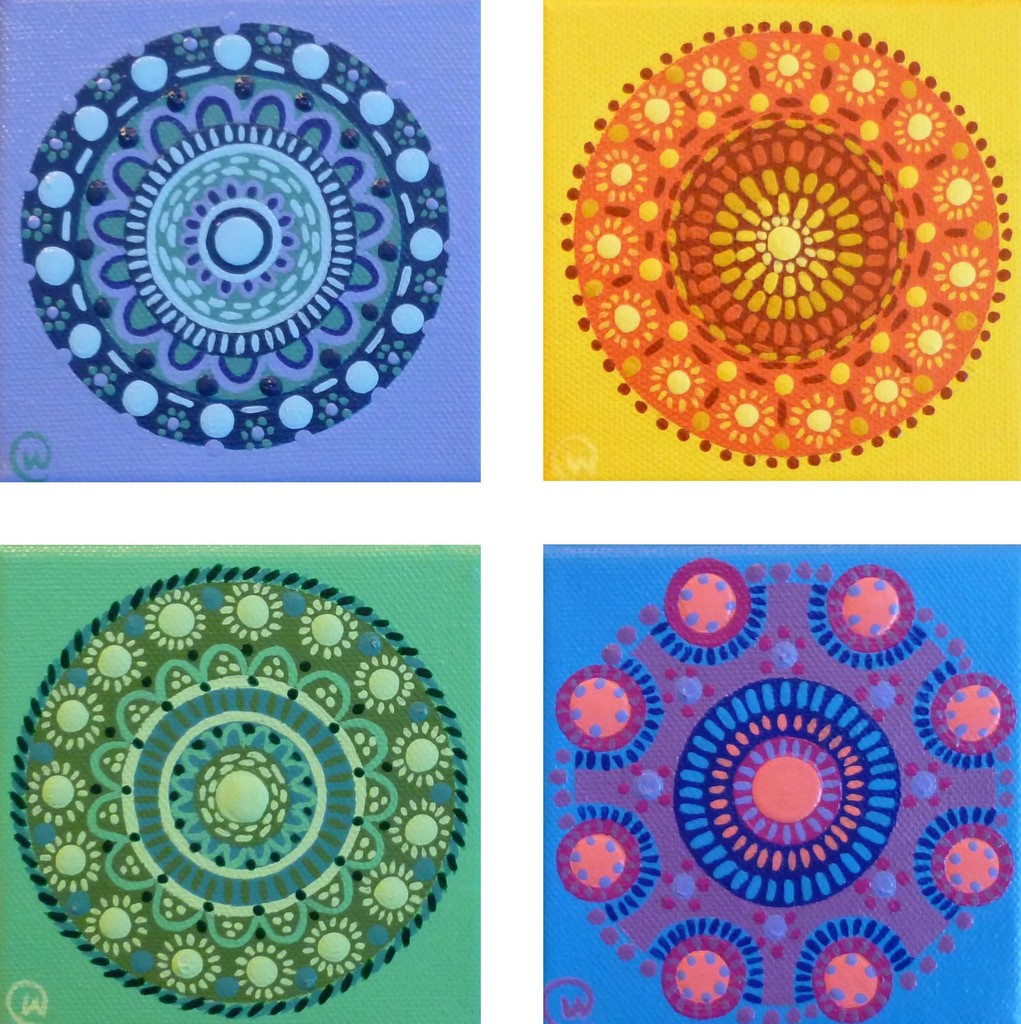 Kleine schilderijtjes van een vierkante decimeter, per stuk te koop (enkel linksboven is nog beschikbaar)
