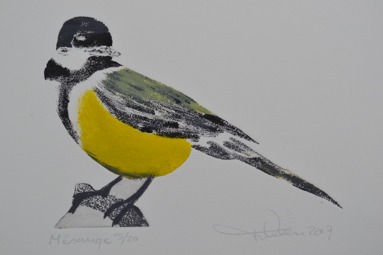 Koolmees - Mésange - droge naald en aquatint - uitgezaagd zinkplaatje - meerkleurendruk - oplage 20