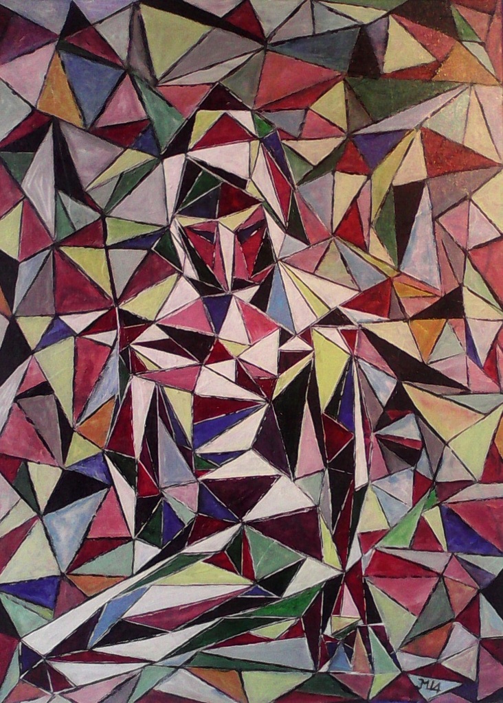 Dit portret is gemaakt met als basis een wazige zwart-wit foto ca 1950. Nu uitgevoerd tot een werk volledig in driehoeken waarbij het beeld nog wel bestaat maar opgaat in de omgeving.
