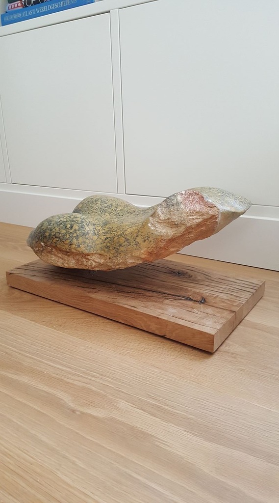 Raindrop serpentijn. Zwevend geplaatst op sokkel van oud eiken wagon deel.