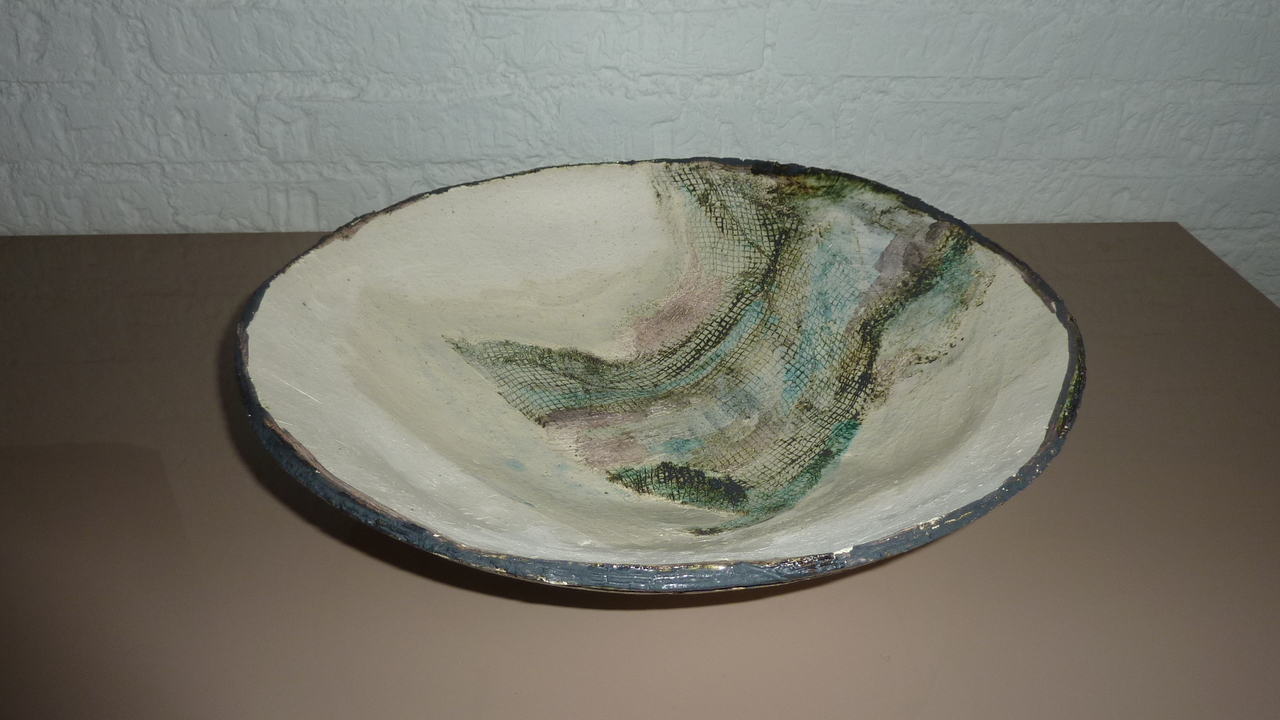 Grote schaal van grove chamotte klei en bewerkt met diverse oxides. Doorsnede 38cm.