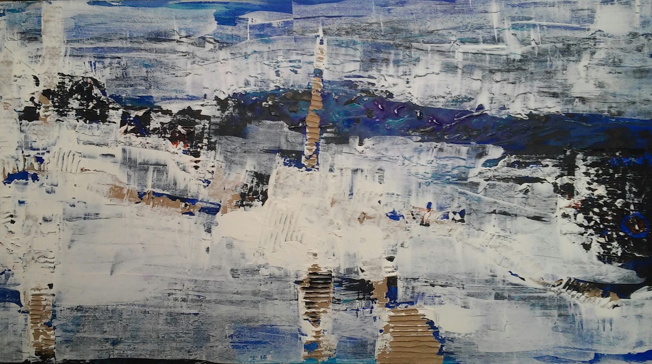 IJzige vlaktes ogen koud, maar oh zo prachtig. Mixed media met acrylverf en karton op paneel.