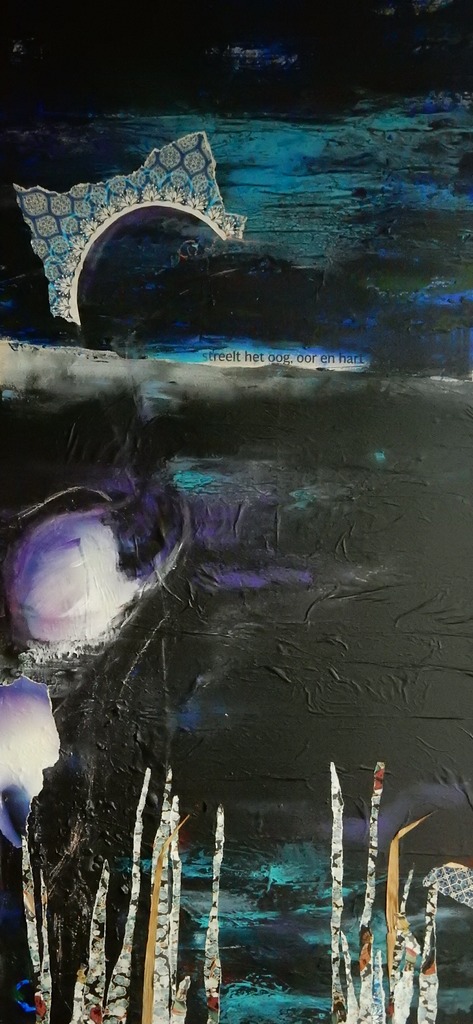 Streelt oog, oor en hart. Collage en acryl op paneel.