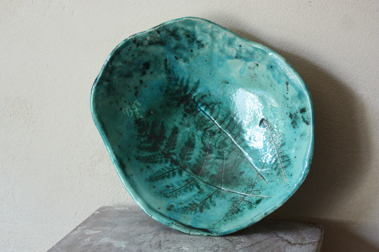 In de klei is een subtiele afdruk van een varenblad weergegeven.