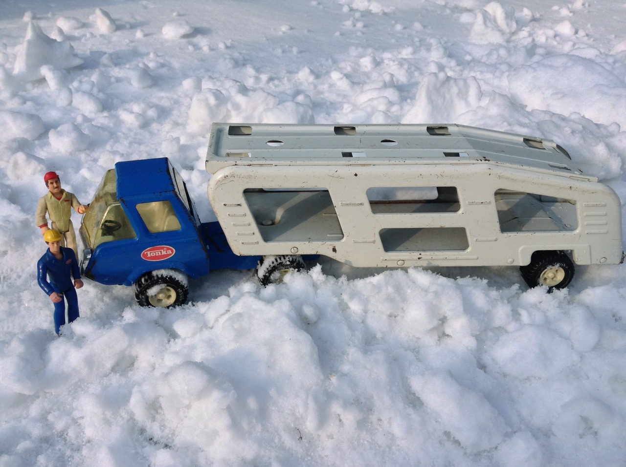 Wat is er mooier dan spelen met een speelgoed Tonka truck in de sneeuw.