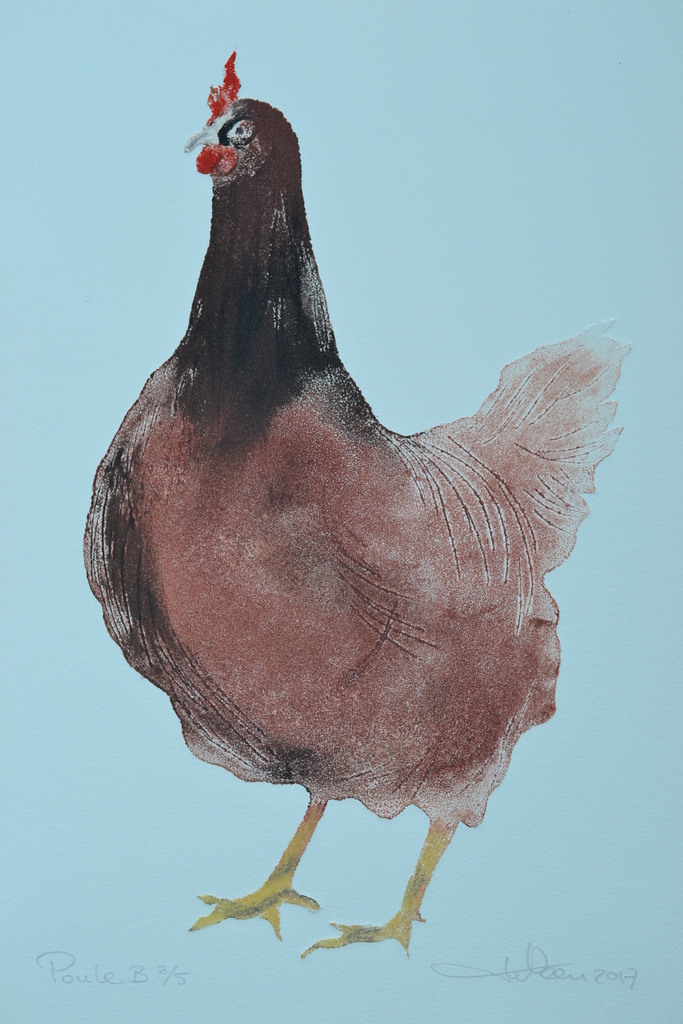 Kip B / Poule B - droge naald en aquatint - uitgezaagde zinkplaat - meerkleuren druk - oplage 1/5
