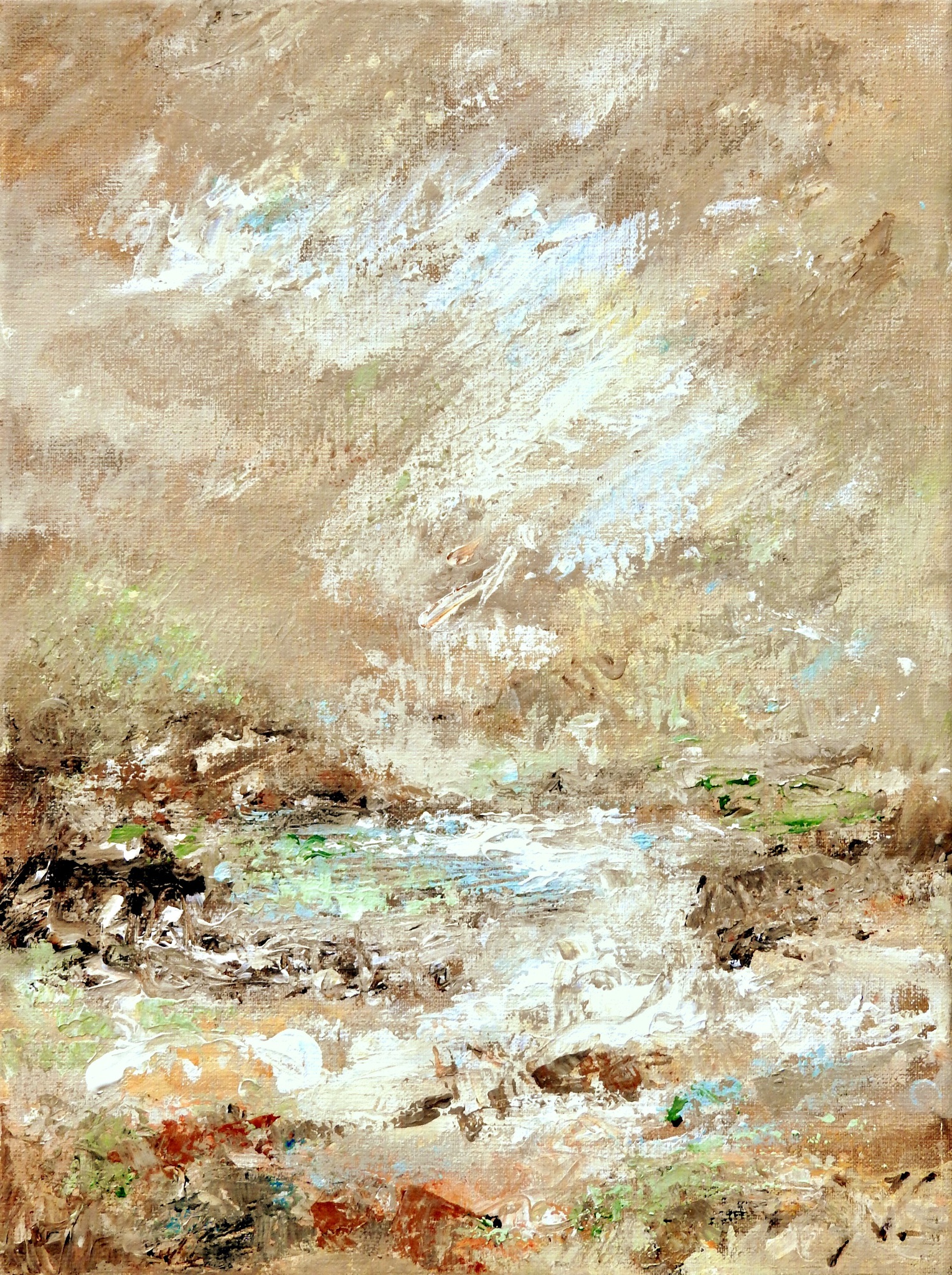 Expressief en krachtig geschilderd is dit een compact semi-abstract natuurlijk landschap. Aardse kleuren in bruin en groen, robuuste penseelvoering en textuur roepen een gevoel op van een ruig landschap waar je kan kanoën, kajakken of raften op de kronkelige rivieren. Het werk is geïnspireerd op de Belgische Ardennen. Over het werk: gesigneerd · acryl op linnen · opgespannen op stevig frame · meegeschilderde zijkanten · klaar om op te hangen Optioneel: naturel houten baklijst. Bij vragen neem gerust contact met mij op →