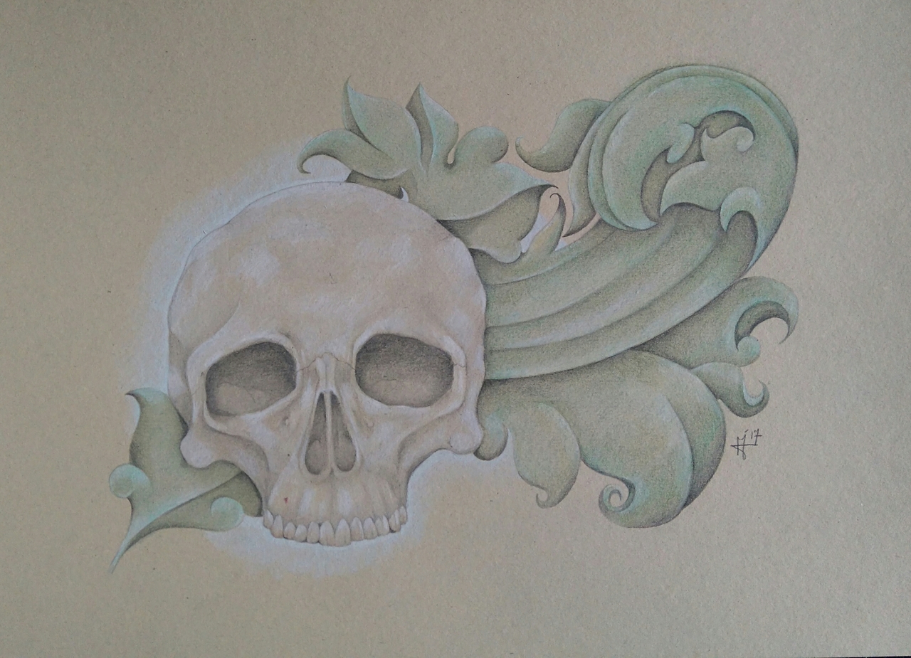 Schedel Skull Doodshoofd Dood Blad Groen Stilleven Kraft Kleurpotlood