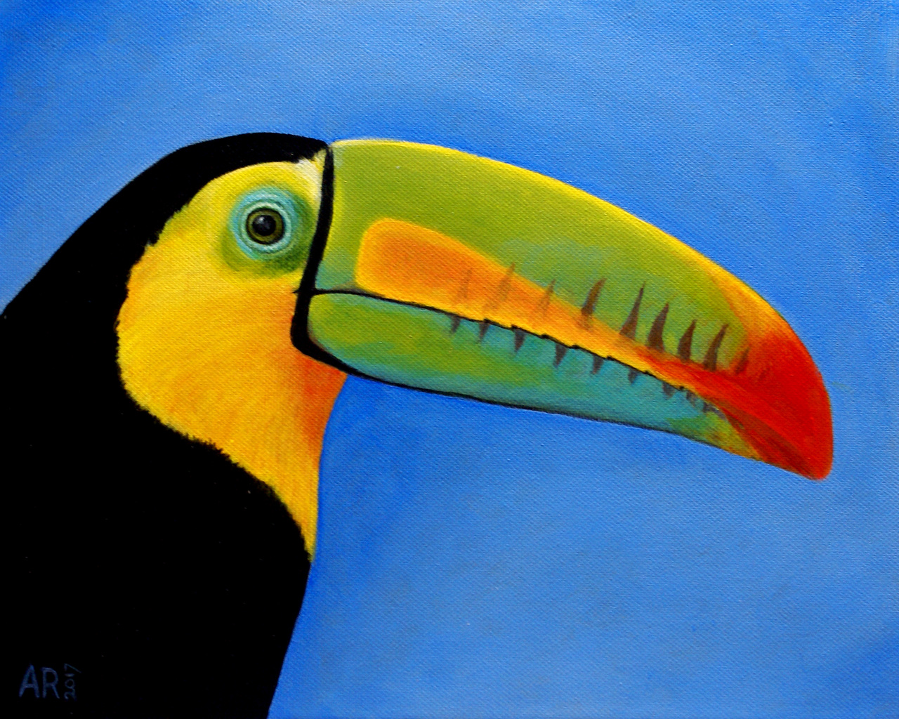 Schilderij Rood Oranje Geel Zwart Blauw Vogel Groen Dieren Painting Bird Kleur Vogels Toekan Toucan Vogelkunst Bird-art