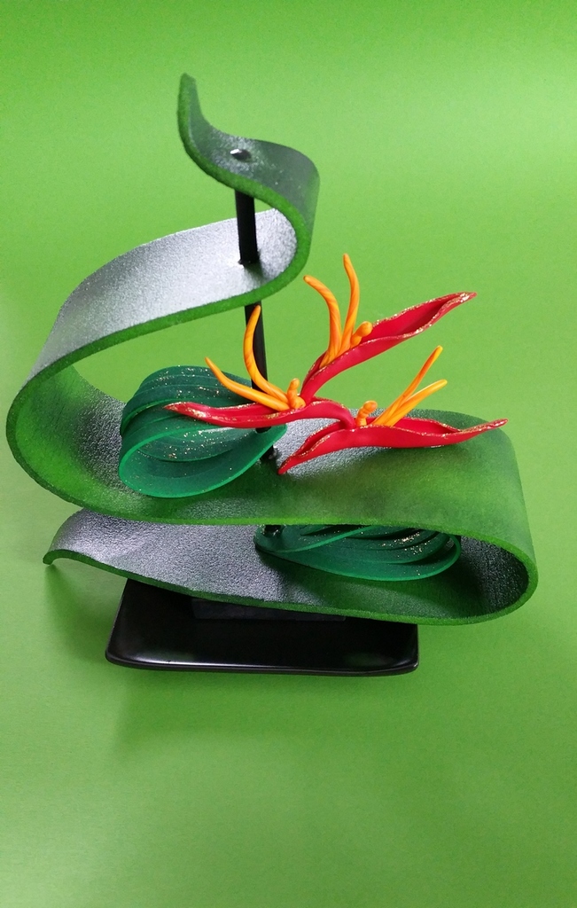 Ikebana met Papegaaibloem, foam ,pvc klei, mixed media Geïnspireerd op de Japanse Ikebana bloemsierkunst.