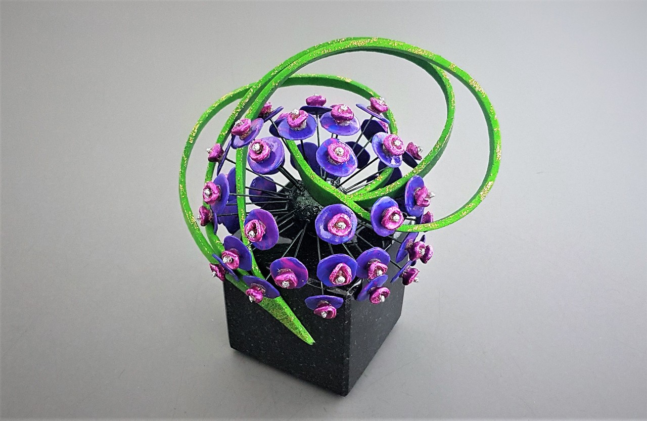Ikebana met Uienbol, foam, keramiek, pvc klei, mixed media