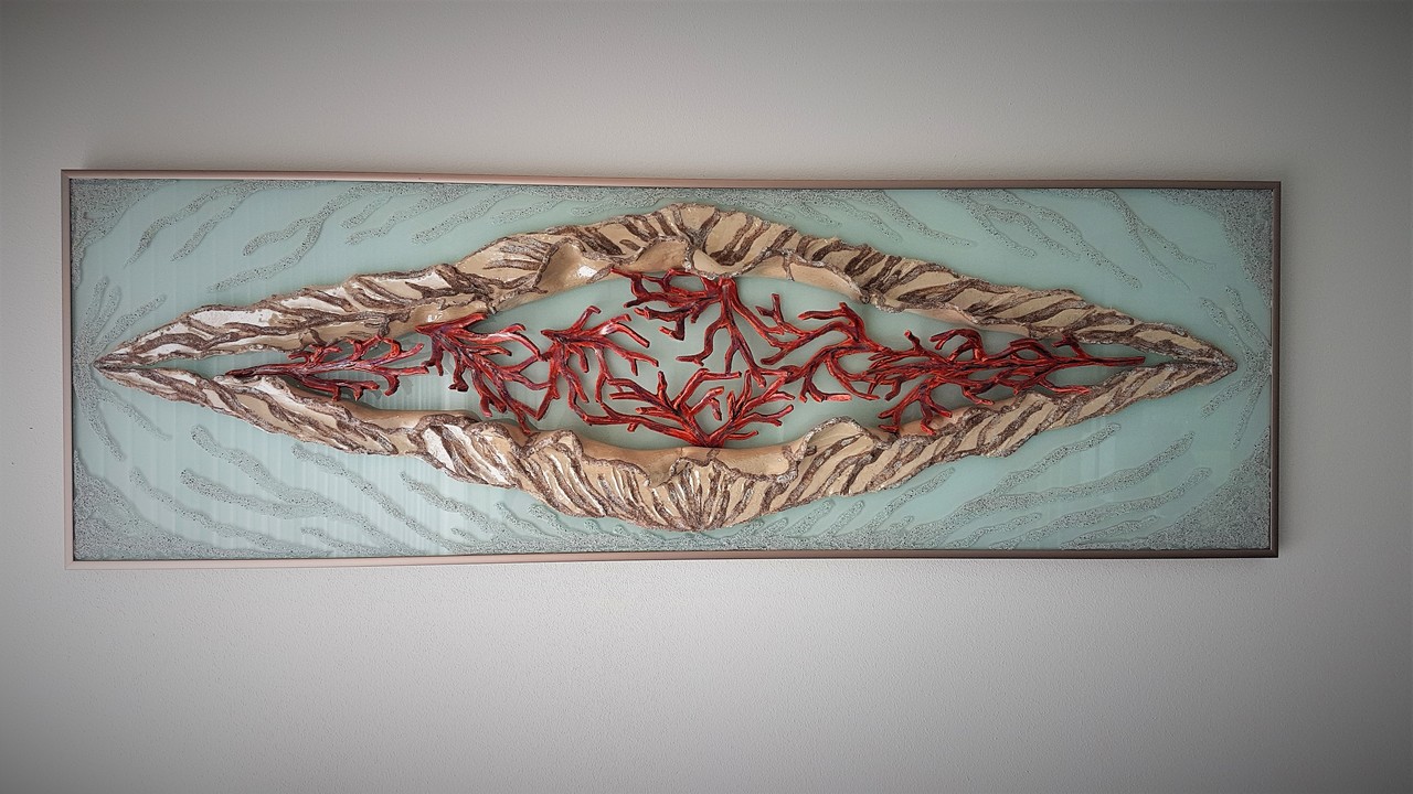 Koraal, keramiek op glas ,wandobject