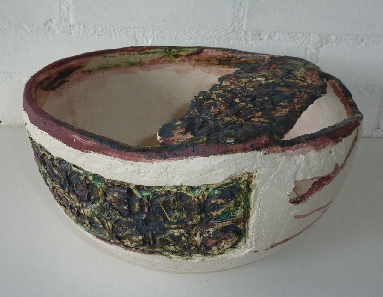 Pot nr 3015 is gemaakt met grove chamotte klei en bewerkt met koper/ijzer oxides door snede 28 cm.