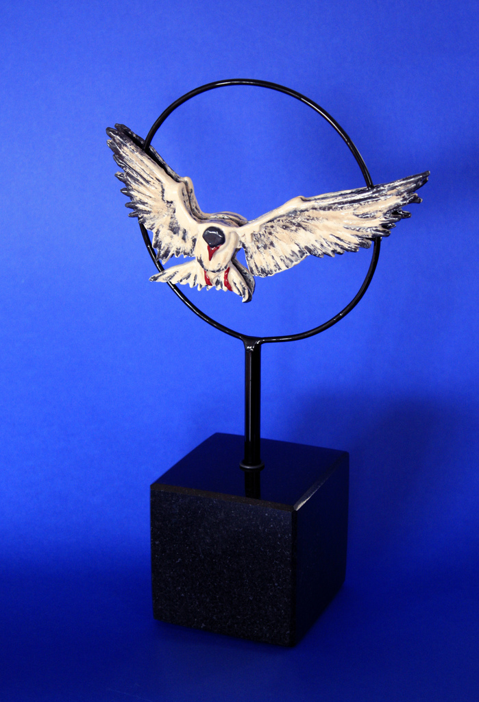 Stern in vlucht, keramiek,sokkel zwart graniet.