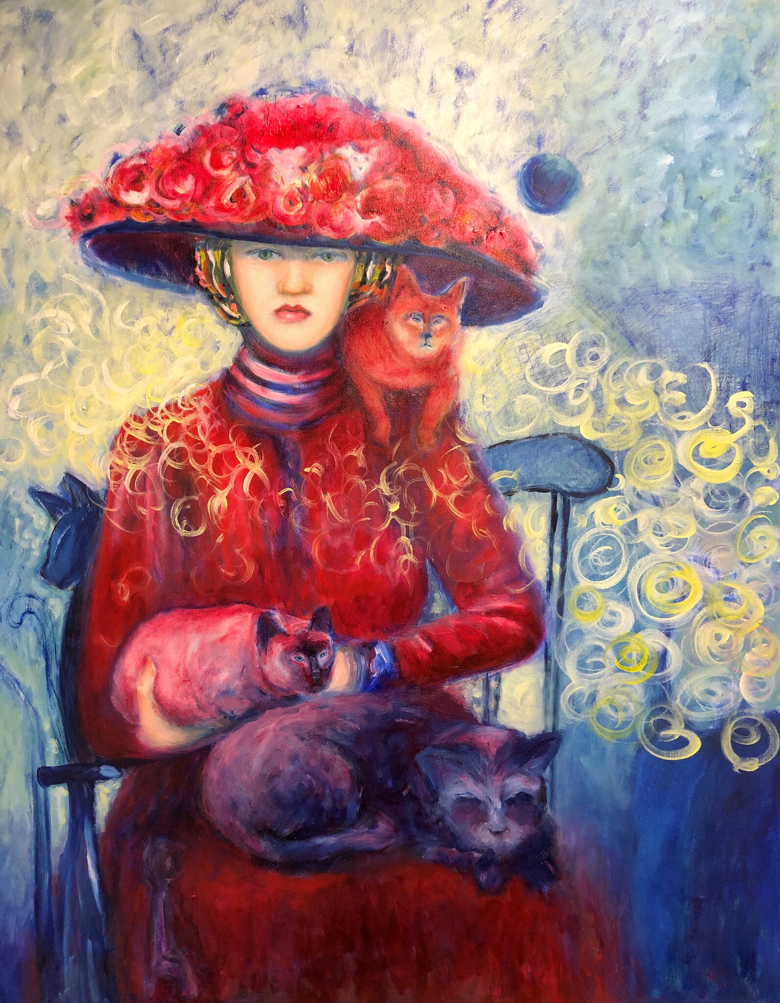 Schilderij Rood Blauw Vrouw Portret Blue Woman Kat Portrait Painting Red Lady Katten Cat Dame Cats