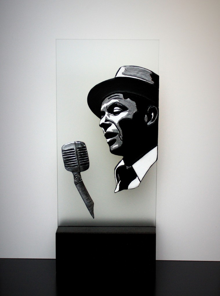 Frank Sinatra, keramiek op glas, sokkel van zwart graniet