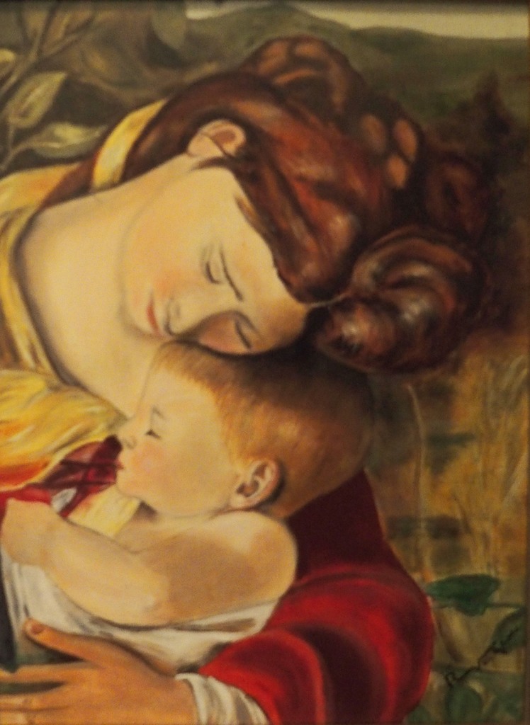 Een detail uit het schilderij van Caravaggio: " De rust tijdens de vlucht naar Egypte". Als grote bewonderaar van Caravaggio heb ik dit lieflijk tafereel geschilderd.