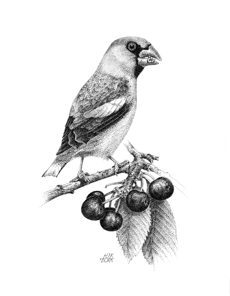 Appelvink regelmatige te zien in onze tuin. fineliner 0,05/0,1 alleen puntjes zwartwit 250.000x