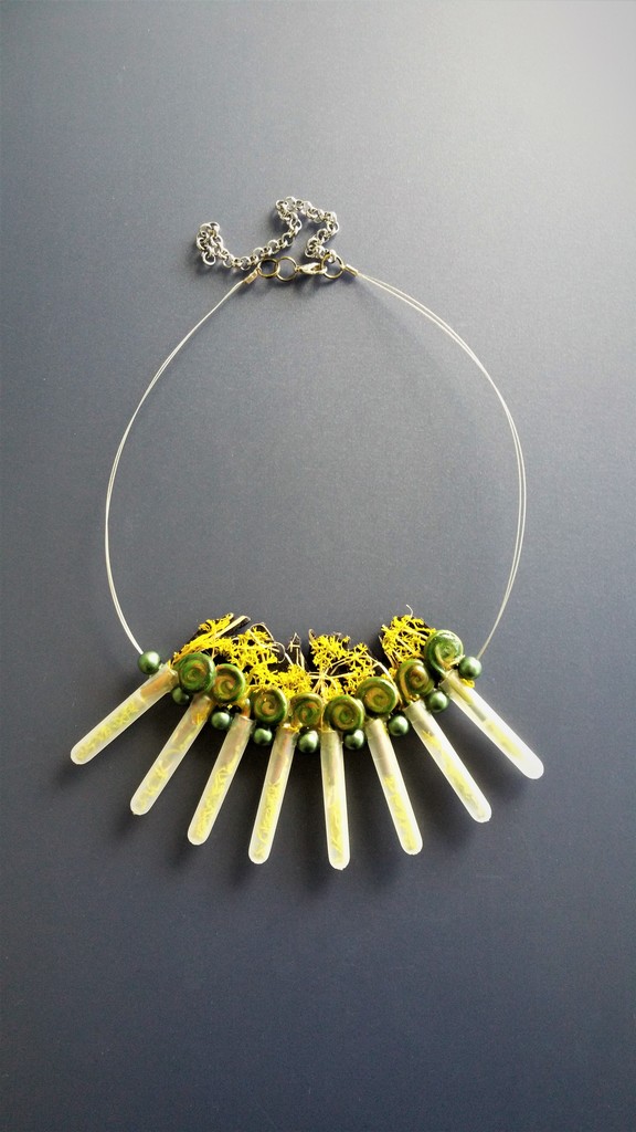 Halssieraad varen, pvc klei, buisjes, mos, mixed media