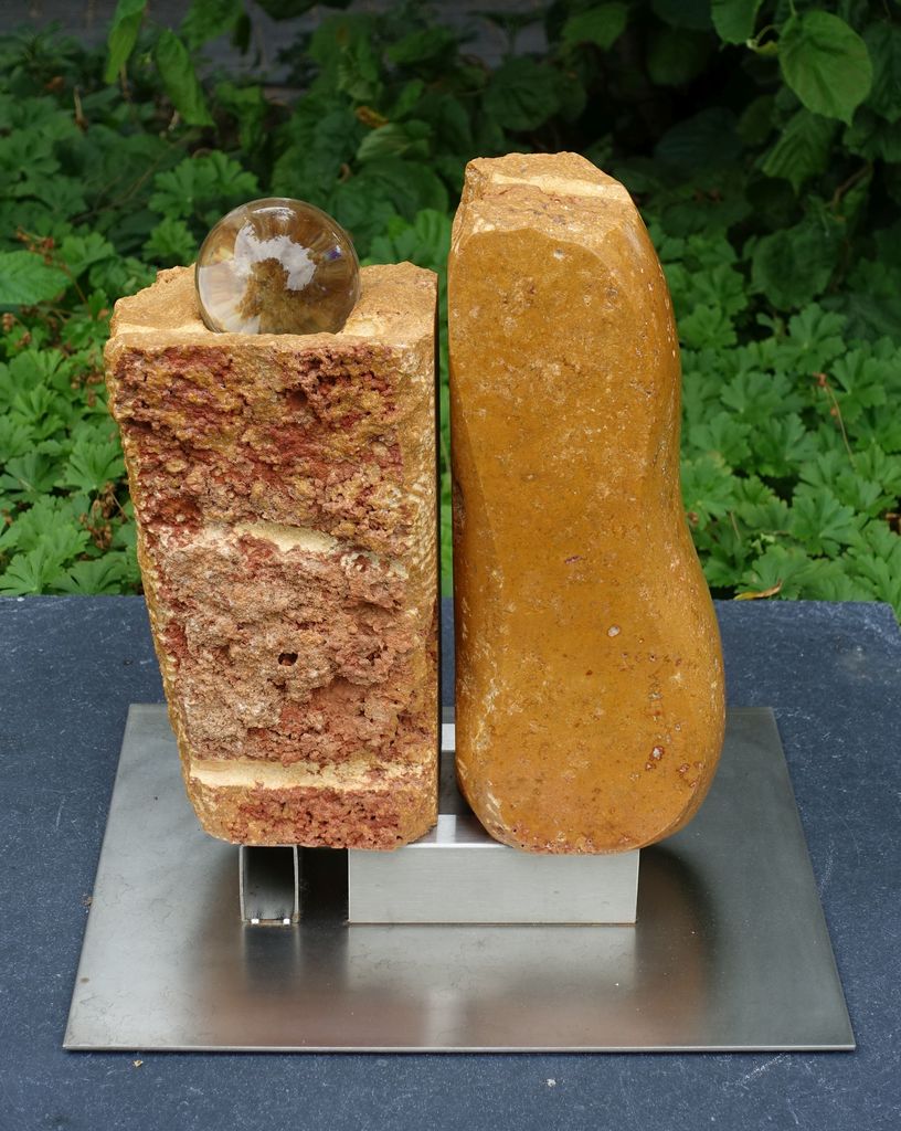 Naar aanleiding van het dansende huis in Praag heb ik dit beeld gemaakt in het projekt vakantie. Het is gemaakt in travertin, met RVS en een glazen bol.