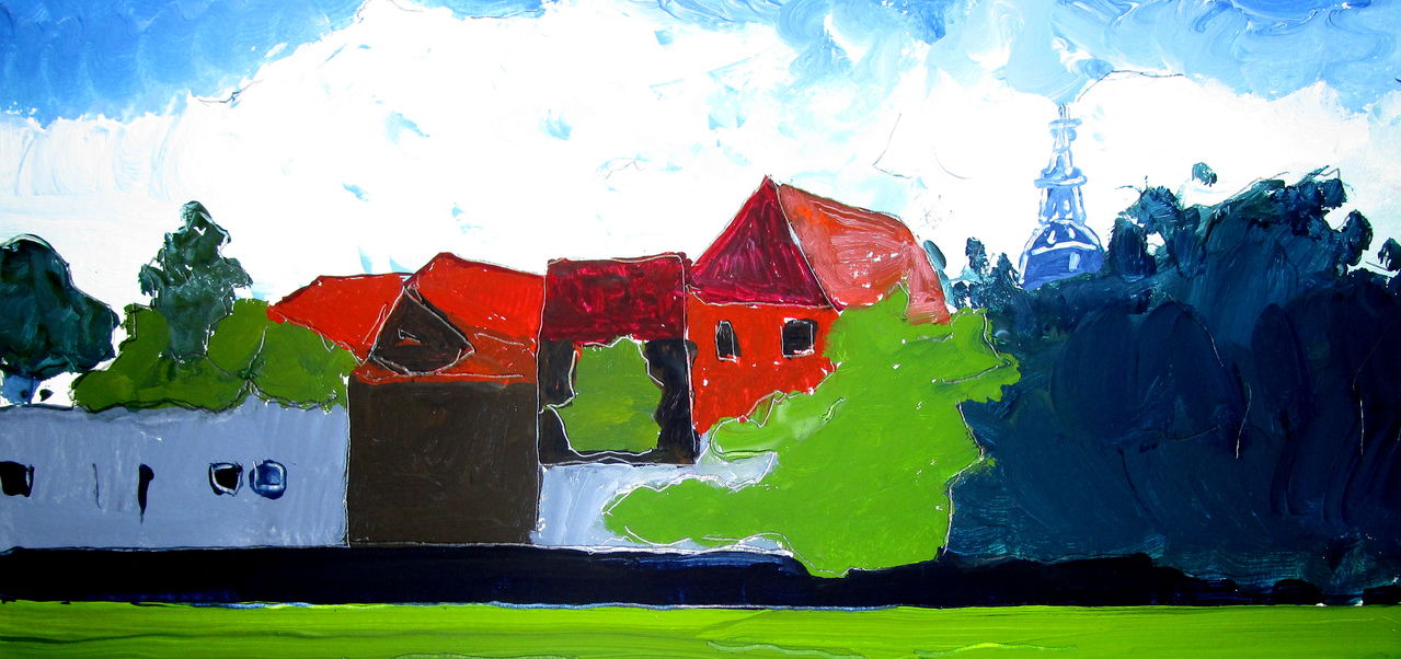 Wolken Stadje Huizen Kerk Toren Bomen Struiken Gevels Daken Blauw Wit Groen Rood Bruin Grijs