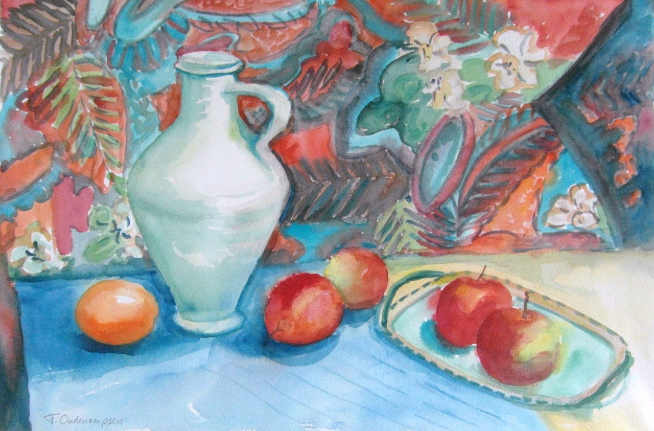 Rood Blauw Groen Aquarel Stilleven Sfeer Appels Kruik Oosterse Spaanse