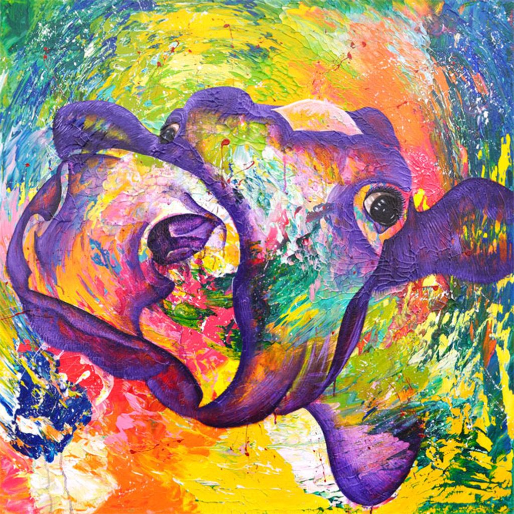 VERKOCHT. Kleurrijk koeienschilderij, 80x80x4cm.