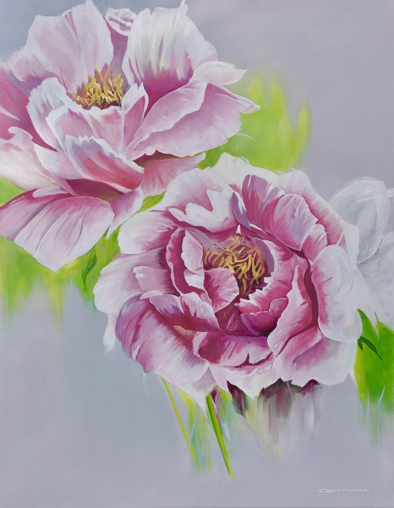 3 pioenen wit met rood en roze op grijs geschildert