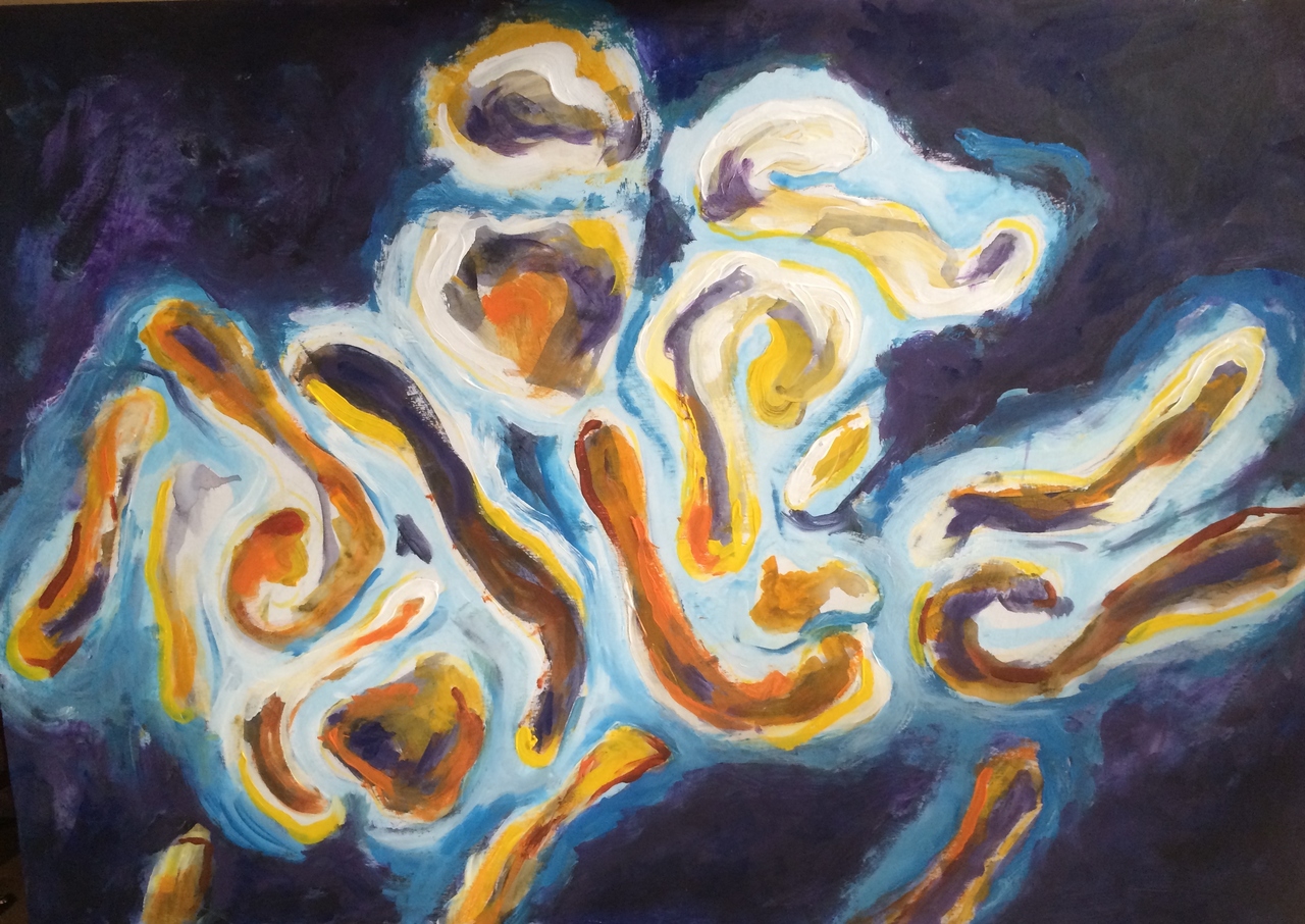 Een kleurrijk beeld, dat voor je ogen danst. Inspiratie was een groepje ebola virussen onder een microscoop.