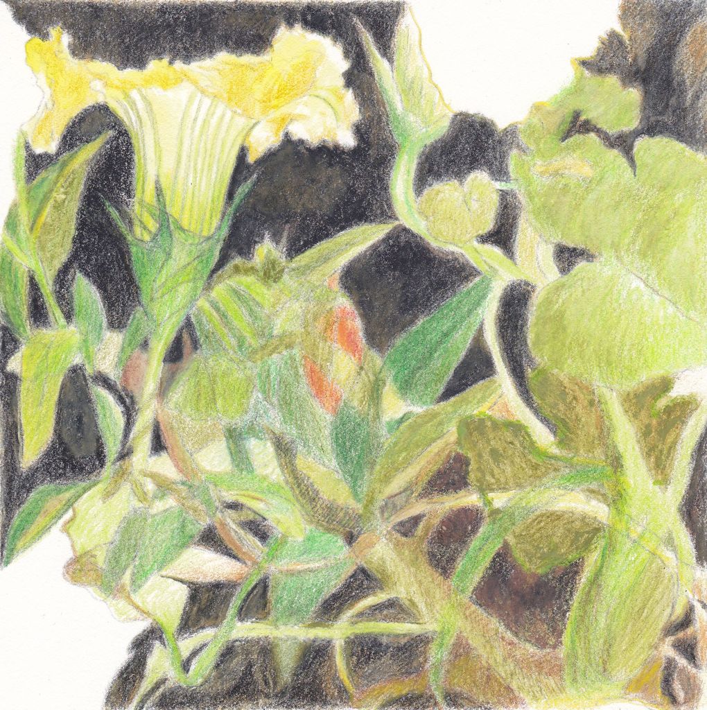 Wit Geel Zwart Groen Bruin Tekening Bloem Blad Plant Patroon Aquarelpotlood Motief Courgette