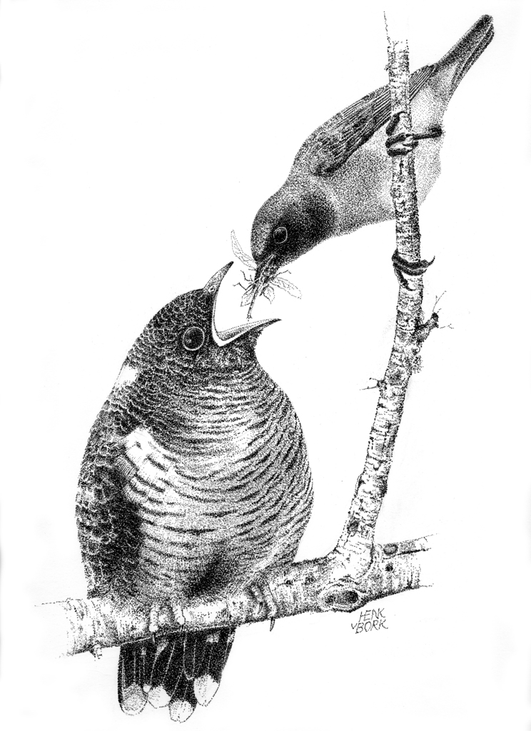 Jonge koekoek gevoed door mannetje gekraagde roodstaart. Getekend met fineliner 0,05/0,1 alleen maar stippen ongeveer 350.000x