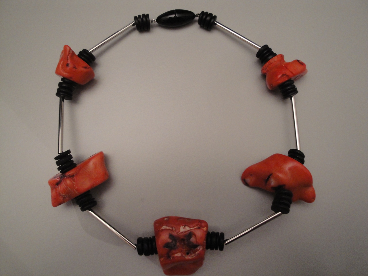 onregelmatige koraalbrokken tussen metalen staafjes en zwarte cocosschijfjes; zwart magneetslot; lengte ongeveer 46 cm