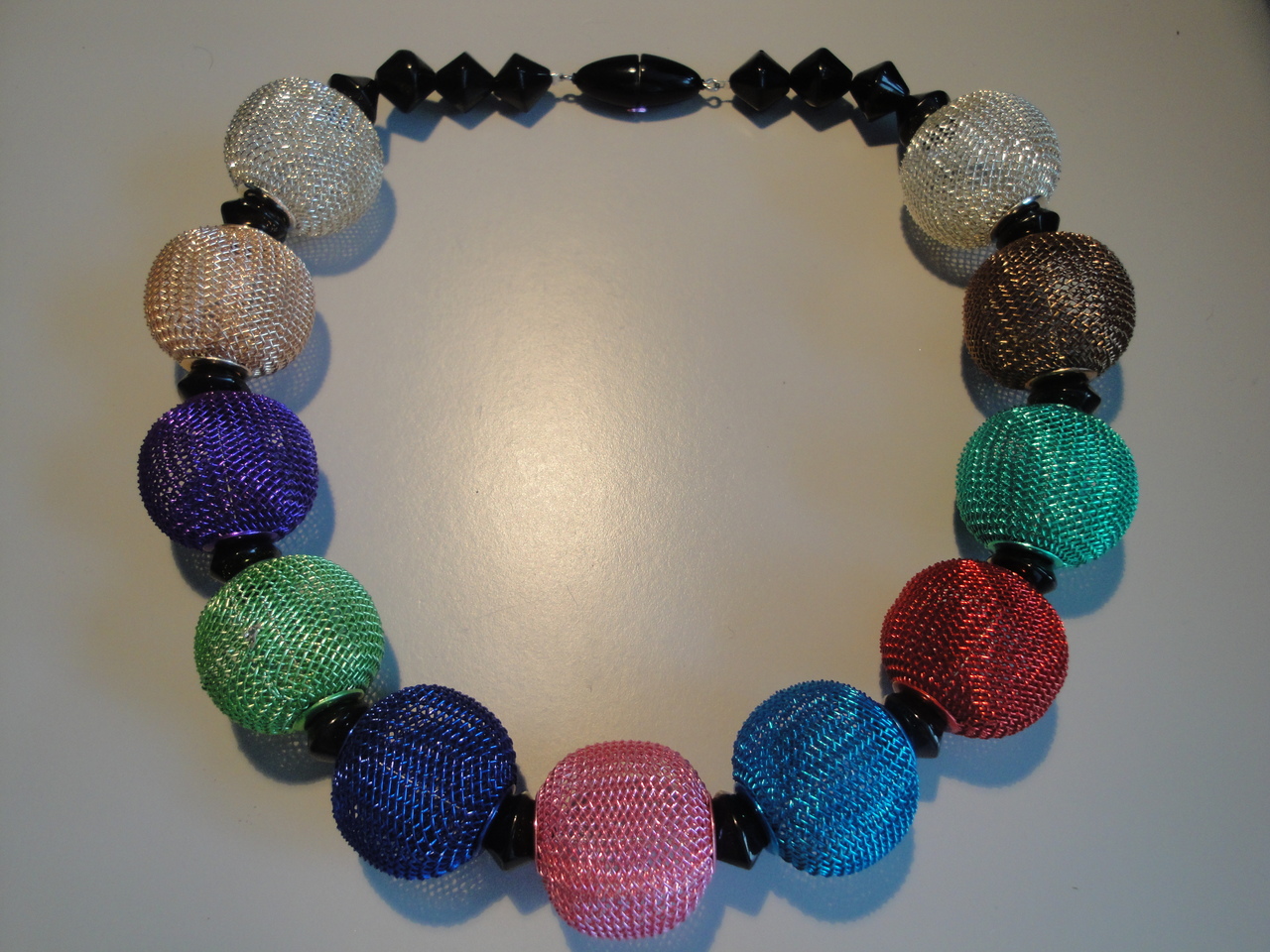 Van metaaldraad geweven bollen (doorsnede 2,7 cm) in verschillende kleuren; daartussen zwarte glaskralen en een zwart magneetslot; lengte ongeveer 47 cm