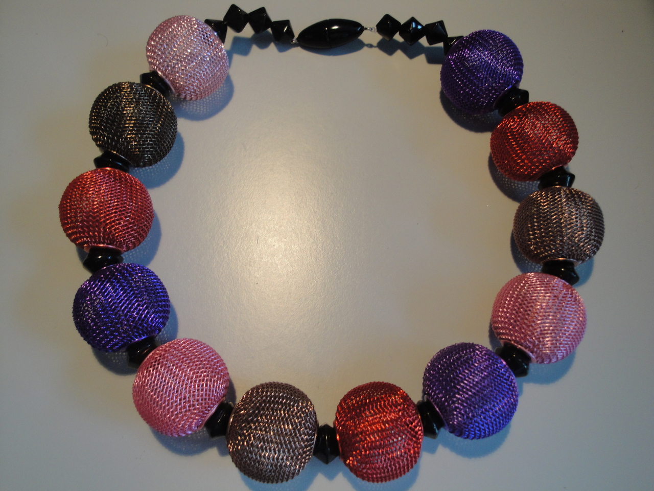 Van metaaldraad geweven bollen in rood/paars/rose tinten, gescheiden door zwarte glaskralen; zwart magneetslot. lengte ongeveer 47 cm.