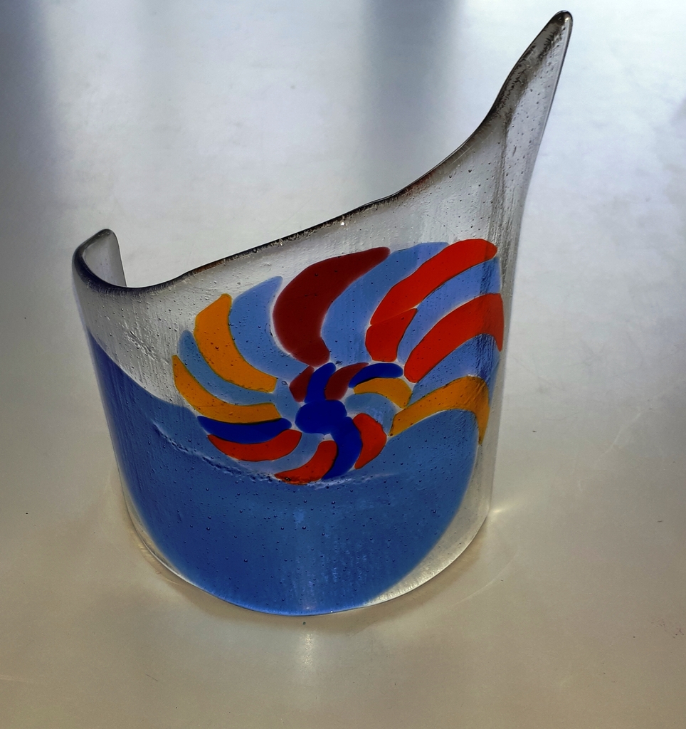 Nautilus in blauw glas met oranje, geel en bruin.