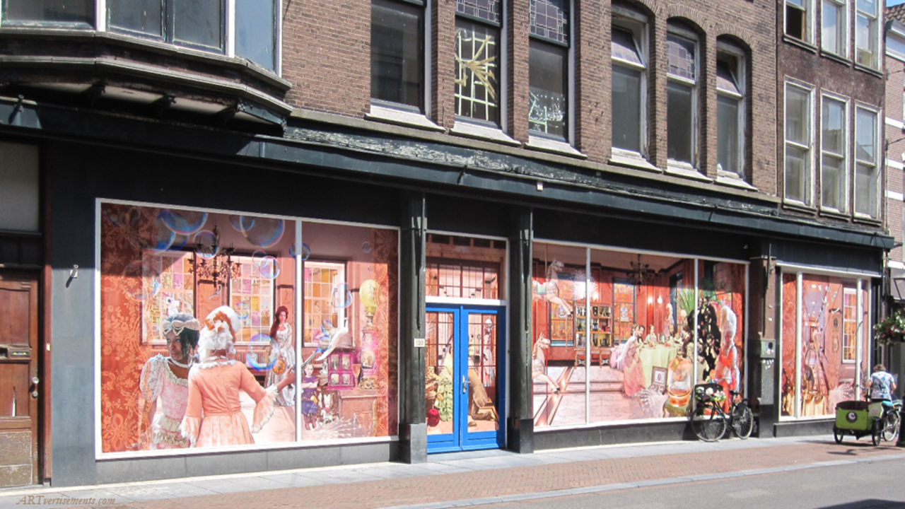 ARTvertisements zijn hier toegepast ten behoeve van leegstand. Ze bevatten foto's van het lokale stadhuis en het centrum van Leiden.
