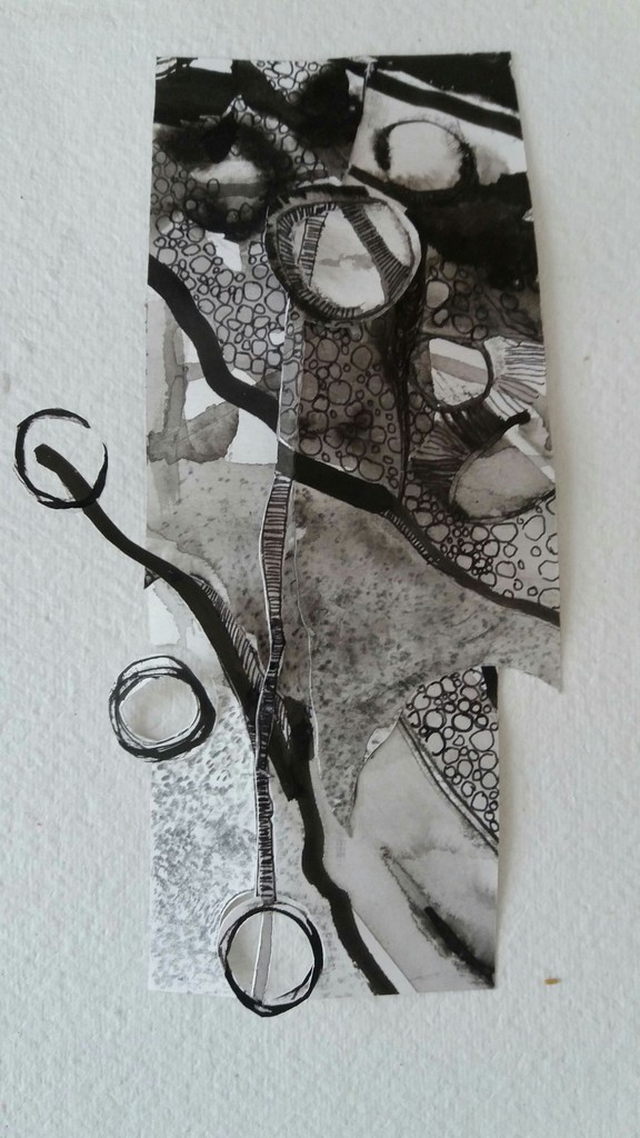 Natuurlijke vormen en patronen zijn het uitgangspunt voor ruimtelijke tekeningen en collages die zich los en speels over de muur verspreiden. Donkere stevige vormen, rond, ovaal, of als schaduwen, vaak gesneden uit karton, vormen een basis. Daarop en daaruit groeit bewerkt papier in allerlei vormen en structuren, heel organisch. Het papier is afwisselend fijn betekend of ruig bewerkt met krijt, inkt, verf, en met mes of schaar. In natuurlijke tinten, maar ook in zwart-wit, met soms juist een fel fluorescerend accent. Fijn als kant of filigraan, ruw als boomschors of een rotsblok. Het werk doet denken aan het lijnenspel van boomtakken, lianen, jonge loten van planten, levende organismen, cellen, of biologische en geologische structuren. Zoals in de natuur alles ontstaat, groeit en voortdur