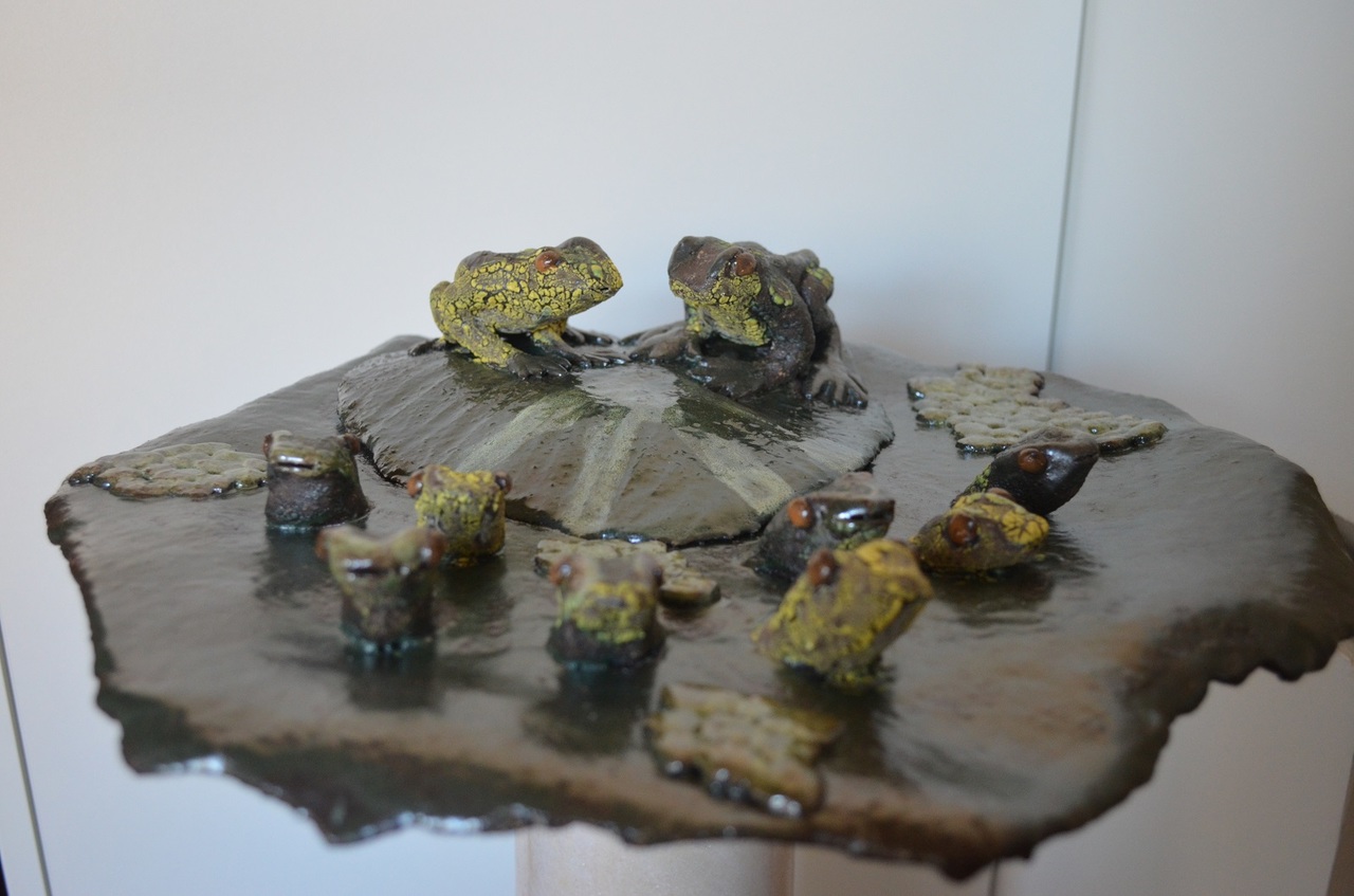 De 10 kikkers geven een avond concert. De twee kikkers op een blad geven de maat aan de overige 8 kikkers in de sloot. Handgevormd object van zwart bakkende klei, geglazuurd met verschillende glazuren.