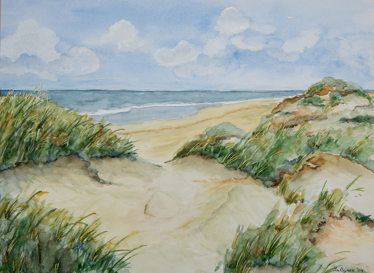 Wit Zee Geel Blauw Wolken Groen Aquarel Realistisch Duinen Zand Vallei